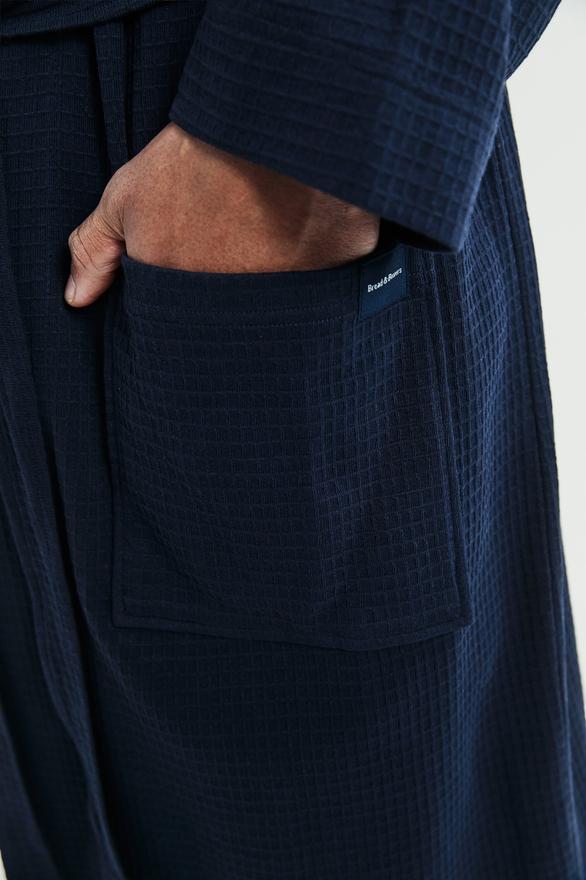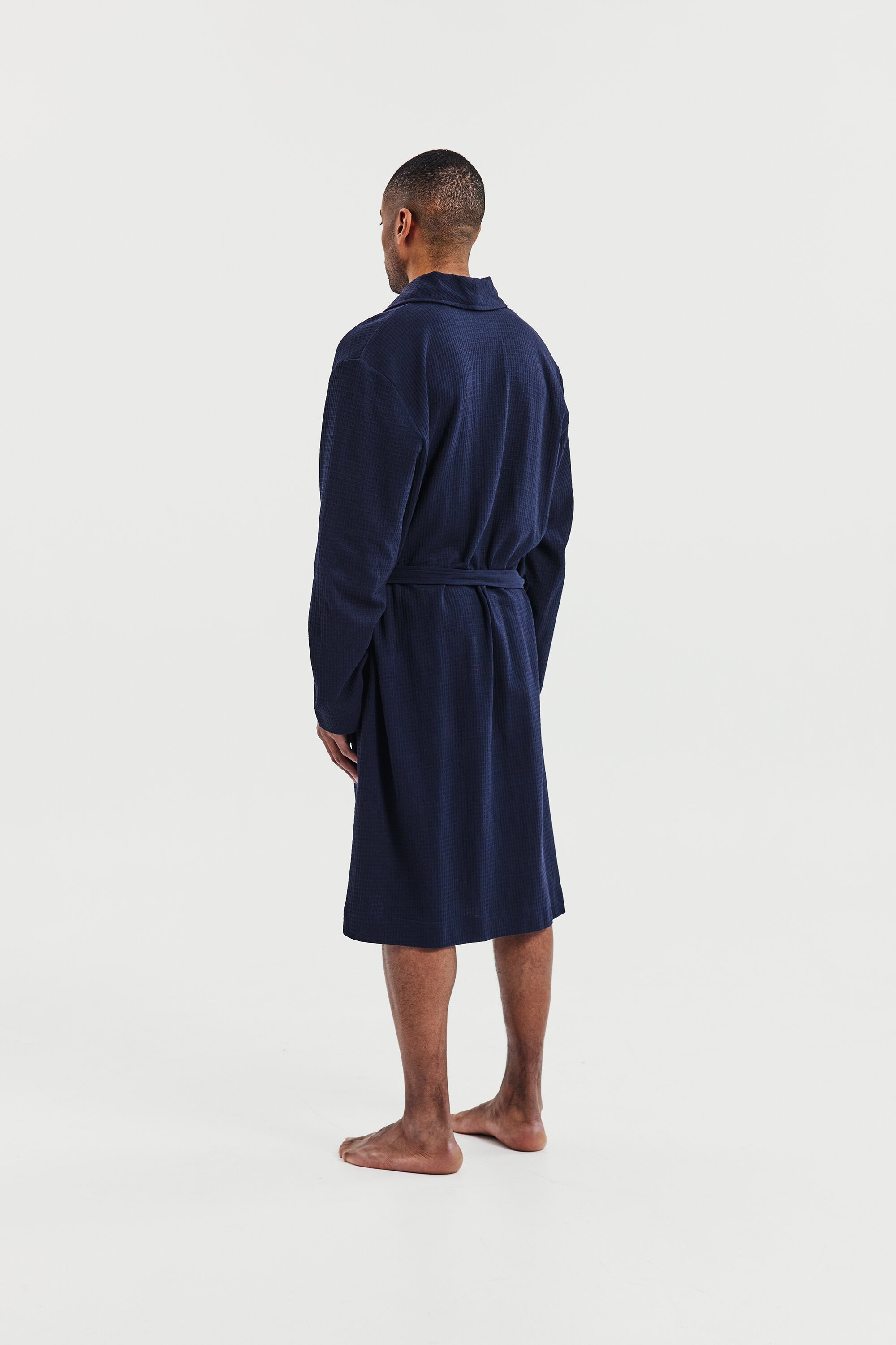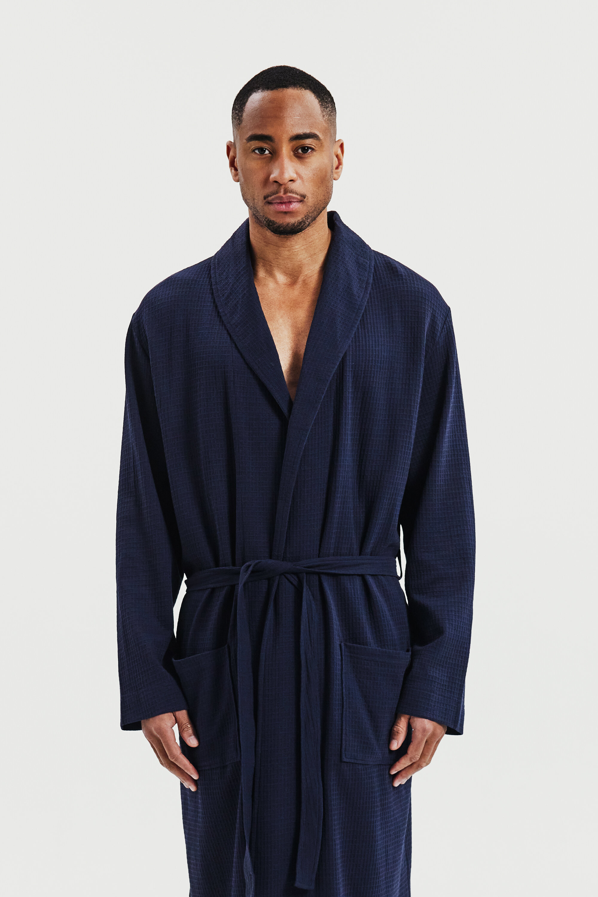 Designed for both comfort and style, this well-fitted cotton waffle-knit robe features a belt and double front pockets. Its versatile design makes it perfect for lounging at home or relaxing by the beach.